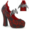 5 inča (127 mm) potpetica, 1 1/2 inča (38 mm) skrivena platforma natikača mary jane s elastičnim remenom s velikom metalnom palicom i detaljima krila šišmiša s nitnama na vrhu pete